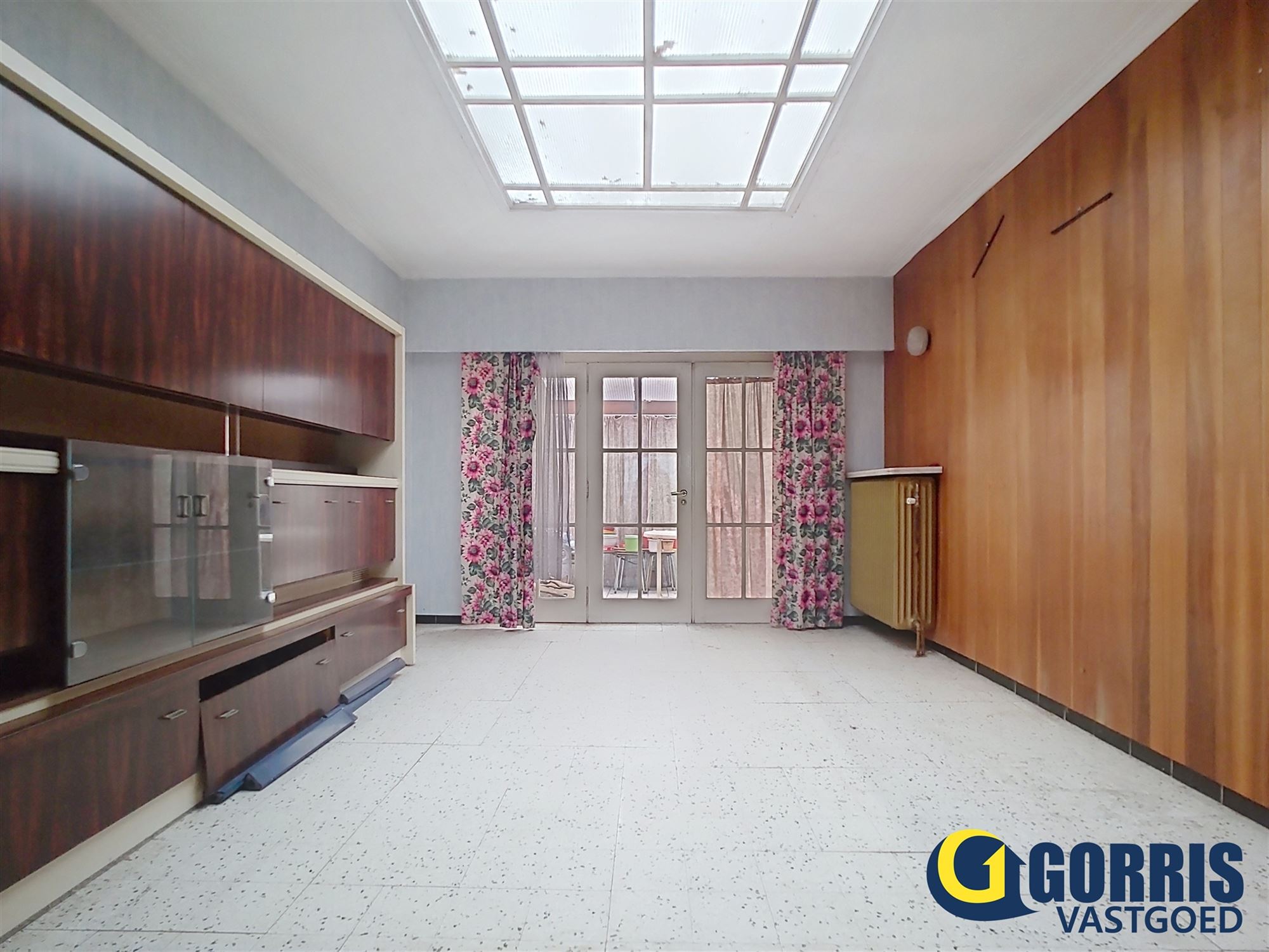 Bij het betreden van de woning komt u in de inkomhal met aansluitende grote bergruimte. De leefruimte bestaat momenteel uit een voor- en achterkamer, gescheiden door een drieluiksdeur. Deze indeling biedt de mogelijkheid om één grote, open en lichtrijke leefruimte te creëren. De achterste leefruimte geniet bovendien van extra daglicht dankzij een lichtkoepel.